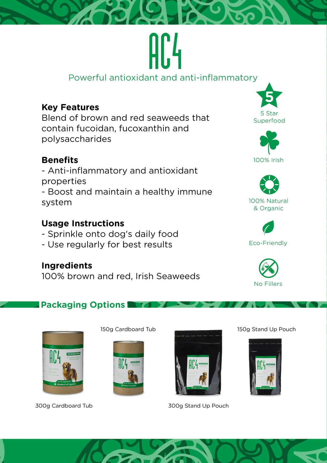 Harness the power of nature with AC4, a specially formulated blend of four sustainably harvested Irish seaweeds. Packed with bioactive compounds like Fucoidan and Fucoxanthin, this natural supplement offers numerous health benefits for your dog.