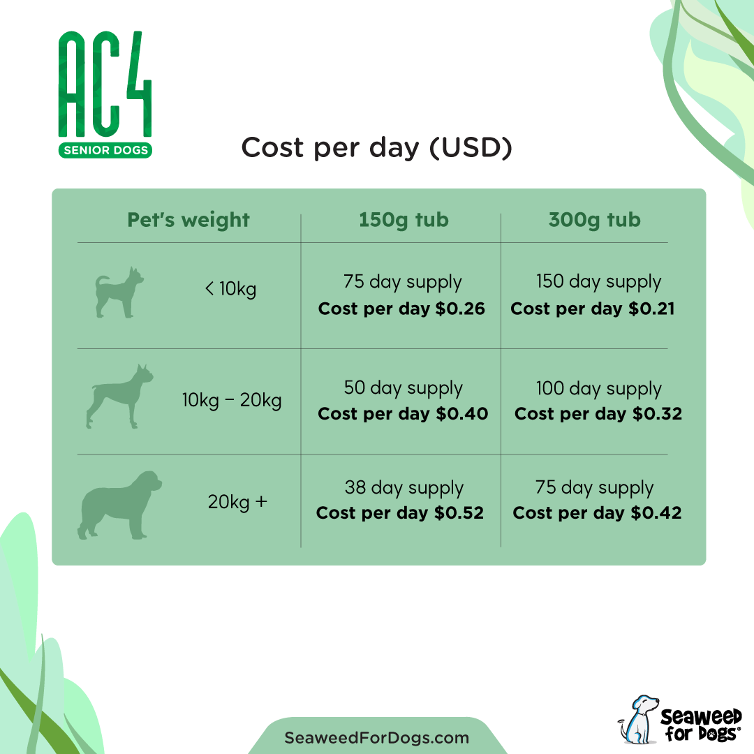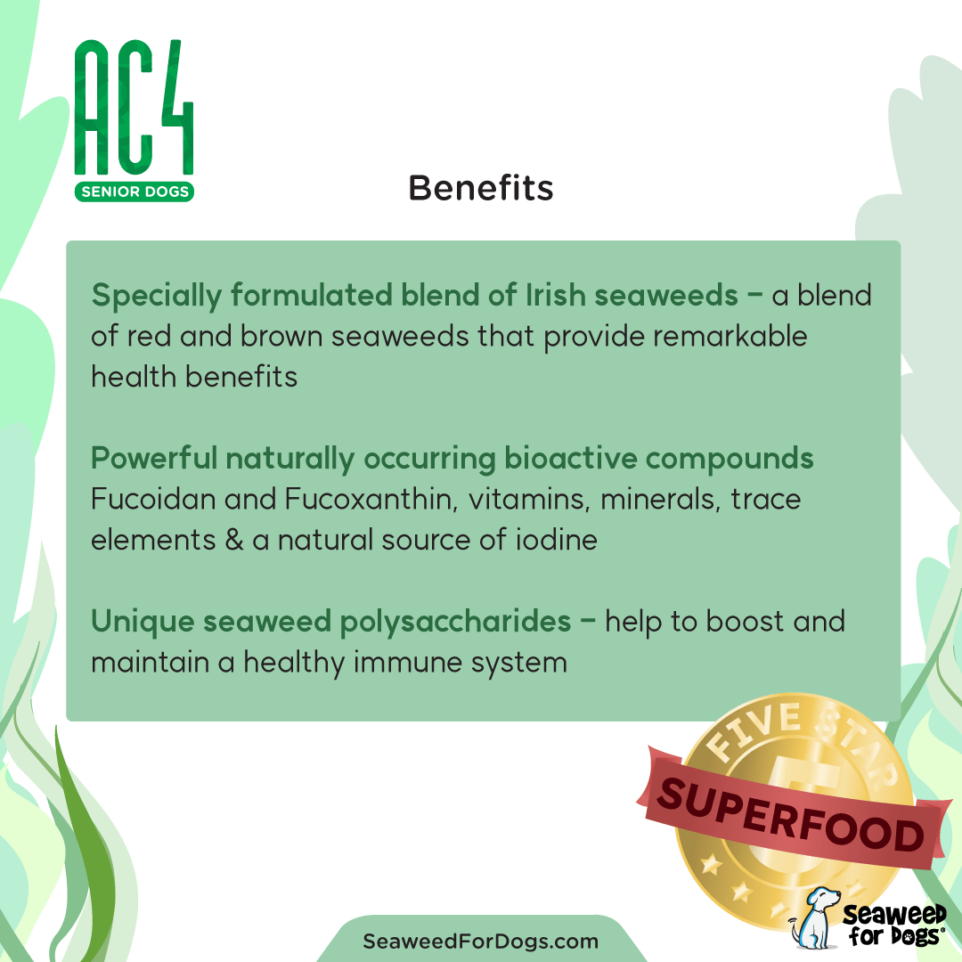 Support your dog's longevity and wellness with AC4, the natural seaweed supplement designed to enhance their overall health. Order now and give your dog the best of nature’s benefits!